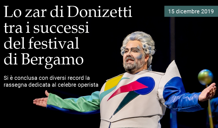 15 dicembre 2019 - L'edizione 2019 del festival Donizetti Opera —organizzato dalla Fondazione Teatro Donizetti e dal Comune di Bergamo con la direzione artistica di Francesco Micheli e quella musicale di Riccardo Frizza— si è chiusa alcuni giorni fa con un nuovo record di presenze, oltre a una crescita dei Paesi di provenienza del pubblico straniero e del numero di giornalisti accreditati. Si è superata la soglia delle diecimila presenze —per la precisione 10.293 presenze contro le 8.491 dello scorso anno— corrispondenti a un +21% l’aumento del pubblico totale rispetto al 2018. Paola Cecchini ha assistito a diverse rappresentazioni del festival e, scrivendo per Puntodincontro sul melodramma burlesco in due atti che ha aperto questa quinta edizione —Pietro il Gande, kzar delle Russie—, ha commentato: «impossibile annoiarsi, si è proiettati fin da subito in un mondo incantato dove le regole di quello reale non valgono, o quasi». «I personaggi» —aggiunge la giornalista, scrittrice e traduttrice— «sembrano fluttuare nel palco, le sceneggiature roteano come danzatrici, il paesaggio (rappresentato in forme geometriche ed a colori molteplici e vivacissimi) pare ispirato all’arte di Kazimir Malevich, pioniere dell'astrattismo geometrico e delle avanguardie russe, fondatore della corrente Suprematista». «L’equilibrista circense che danza nel cielo ci ricorda che, grazie all’amore, tutti sono in grado di volare. Gli spettatori sono ipnotizzati anche se lo sapevano già: Chagall —russo pure lui— insegna!». «La messa in scena è opera di Ondadurto Teatro, compagnia romana di ‘teatro urbano’ nota a livello internazionale, che debutta per la prima volta nel mondo dell'opera dopo aver girato il mondo con la sua arte e i suoi enormi macchinari scenici, con tappe che vanno dal Cile alla Germania, dal Venezuela al Regno Unito. Marco Paciotti e Lorenzo Pasquali (assieme a Adriana Laespada) hanno curato in modo attento regia e scene, mentre i costumi sono firmati da K.B, Project e il light design da Marco Alba». «Sul podio Rinaldo Alessandrini al suo debutto donizettiano: offre una bella prova dirigendo la giovane compagnia de Gli Originali i cui musicisti -che utilizzano strumenti d’epoca- suonano accordati a 432 hertz, secondo l’usanza dell’epoca di Donizetti. Buona prova anche per il Coro Donizetti Opera diretto da Fabio Tartari».