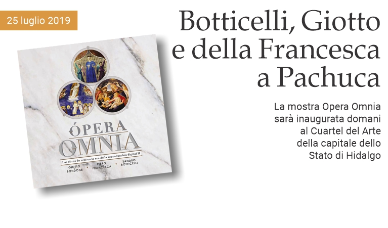 25 luglio 2019 - Domani, venerdì 26 luglio alle ore 19:00, sarà inaugurata al Cuartel del Arte di Pachuca de Soto l'esposizione Opera Omnia, con riproduzioni ad alta risoluzione e a grandezza naturale di 60 dipinti di tre grandi artisti del Rinascimento italiano: Giotto di Bondone (1267-1337), Piero della Francesca (1412-1492) e Sandro Botticelli (1446-1510). La mostra è organizzata dalla Radio Televisione Italiana (Rai), in collaborazione con il Ministero della Cultura federale messicano e il Centro Nazionale delle Arti (Cenart). Assisteranno alla cerimonia Omar Fayad Meneses, governatore dello Stato di Hidalgo, Alejandra Frausto Guerrero, ministro federale della Cultura, María de los Ángeles Castro Gurría, vice direttrice generale del Centro Nazionale delle Arti e Riccardo Cannelli, esperto dell'Istituto Italiano di Cultura. «Le opere della mostra sono state esposte con grande successo [fino al 21 giugno, ndr] presso il Cenart di Città del Messico», ha detto a Puntodincontro Simone Landini, incaricato d'affari dell'Ambasciata d'Italia. (massimo barzizza / puntodincontro.mx)