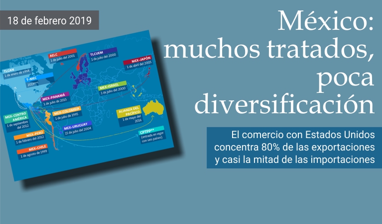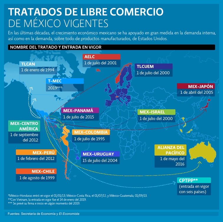 18 de febrero de 2019 - Según datos de la Secretaría de Economía de México, este país latinoamericano ha firmado hasta la fecha 12 tratados comerciales, a través de los cuales intercambia bienes y servicios con 46 naciones alrededor del mundo. Entre ellas se encuentran los 28 miembros de la Unión Europea, Estados Unidos, Canadá, Colombia, Chile, Uruguay, Perú y Japón. A pesar del alto número de acuerdos, la diversificación mexicana, sin embargo, deja mucho que desear. El periódico especializado en finanzas y mercados El Economista publica hoy una infografía en la que se enlistan los principales tratados en vigor, sin embargo, el texto afirma que «En las últimas décadas, el crecimiento económico mexicano ha sentado en gran medida sus cimientos en la demanda interna y en la demanda estadounidense de productos manufacturados». De acuerdo con cifras de la Organización Mundial del Comercio publicadas por Santander, en 2017 los mercados del exterior representaron el 77.6% del PIB del país con el 80% de las exportaciones y 46% de las importaciones concentradas en Estados Unidos. (massimo barzizza / puntodincontro.mx)