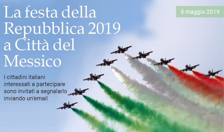 5 maggio 2019 - Il ricevimento in occasione della Festa della Repubblica Italiana si terrà quest'anno martedì 4 giugno 2019 alle ore 13.00 presso l’Istituto Italiano di Cultura alla presenza del Dottor Ricardo Merlo, Sottosegretario al Ministero degli Affari Esteri e della Cooperazione Internazionale. I cittadini italiani interessati a partecipare sono invitati a segnalarlo inviando entro il 24 maggio una email all’indirizzo: messico.eventi@esteri.it, indicando nome e cognome, un recapito cellulare e allegando copia del passaporto italiano. La registrazione è individuale. Le registrazioni saranno accettate sino al raggiungimento della capienza dell’evento. A conferma dell’avvenuta registrazione, entro il 1 giungo verrà inviato via email un invito nominativo, con tutti i dettagli dell'evento, che dovrà essere stampato e presentato all’ingresso. Si ricorda che l'accesso sarà consentito solo ai connazionali previamente registrati secondo le modalità descritte. (massimo barzizza / puntodincontro.mx)