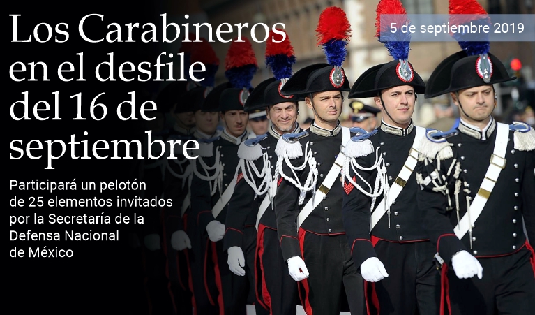 5 de septiembre de 2019 - El lunes 16 de septiembre, en la Plaza de la Constitución de la Ciudad de México, un pelotón de representación compuesto por 24 Carabineros italianos —cadetes estudiantes de la Escuela de Marescialli e Brigadieri— y un oficial de la Oficina de Cooperación Internacional del Comando General fueron invitados y participarán en el desfile que la Secretaría de la Defensa Nacional de México organiza con motivo de las celebraciones del 209 aniversario de la independencia del país. En el evento también participarán representantes de corporaciones armadas de otras naciones, entre las cuales Argentina, Chile, España, Polonia y Portugal. La Guardia Nacional (GN) encabezará la formación con bloques de proximidad social, bloques operativos y la banda de guerra, además de los agrupamientos montado y motorizado. Luis Rodríguez, comandante de la GN, declaró que está programado el despliegue de 4 mil 637 efectivos de esta institución. (massimo barzizza / puntodincontro.mx)
