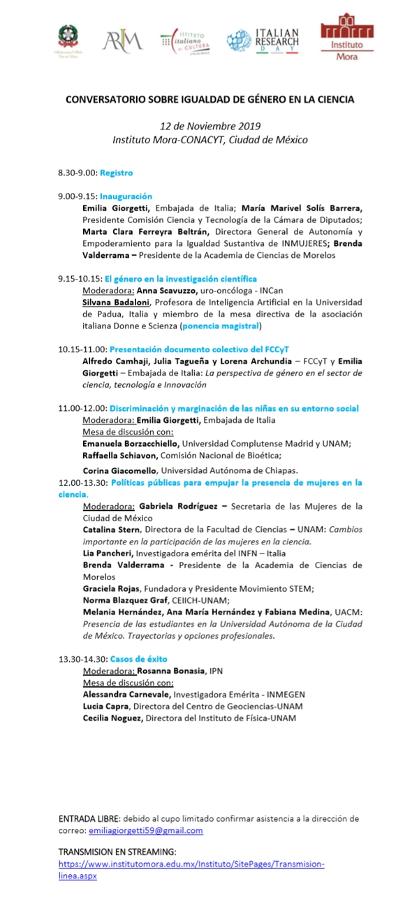 llevará a cabo el Seminario sobre igualdad de género en la ciencia. Los trabajos serán presentados por Emilia Giorgetti, agregada científica de la Embajada de Italia, María Marivel Solís Barrera, presidenta de la Comisión de Ciencia y Tecnología de la Cámara Federal de Diputados, Marta Clara Ferreyra Beltrán, directora general de Autonomía y Empoderamiento para la Igualdad Sustantiva del Instituto Nacional de las Mujeres, y Brenda Valderrama, presidenta de la Academia de Ciencias del Estado de Morelos.