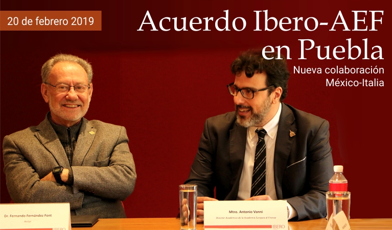 20 de febrero de 2019 - El pasado 14 de febrero, en la sede de la Universidad Iberoamericana de Puebla (Ibero), el rector, Fernando Fernández Font, y Antonio Vanni, director académico de la Accademia Europea di Firenze (AEF), se reunieron para signar un convenio de colaboración, con la finalidad de promover y mejorar las actividades educativas, académicas y de investigación de ambas instituciones. El acuerdo prevé el intercambio de profesores e investigadores, de estudiantes de pregrado y posgrado, así como la reciprocidad de información y recursos académicos de interés. En las cláusulas se incluye también el desarrollo de la investigación colaborativa, la realización de simposios-conferencias y la implementación de programas de educación a corto plazo en el extranjero.