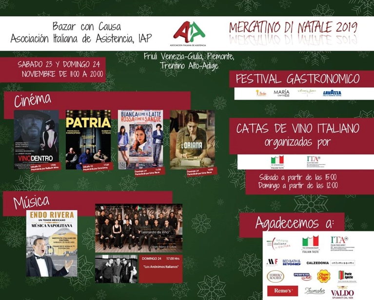 23 novembre 2019 - Oggi e domani —23 e 24 novembre— si svolge dalle ore 11:00 alle 20:00 con ingresso gratuito, il Mercatino di Natale - Bazar di beneficienza dell'Associazione Italiana di Assistenza (AIA) presso l'Istituto Italiano di Cultura di Città del Messico. L'evento si realizza nell'ambito della 4ª Settimana della cucina italiana, organizzata dall'Ambasciata d'Italia e dall'Agenzia ICE/ITA. Il programma —oltre all'ormai tradizionale vendita di regali di Natale, cibo e bevande— prevede appuntamenti musicali, proiezioni di film, il festival gastronomico delle regioni Friuli-Venezia Giulia, Piemonte e Trentino Alto Adige e degustazioni di vini italiani. Il tenore messicano Endo Rivera interpreterà arie della canzone classica napoletana sabato 23 alle 15:30, mentre domenica 24, rispettivamente alle 15:30 e alle 17:00, sono in programma l'esecuzione di brani di musica classica —con l'Orchestra Leonardo da Vinci dell'Accademia d'Arte di Firenze diretta da Aarón Jiménez— e un concerto di musica pop del gruppo Anonimo italiano. In ambito cinematografico, saranno presentati —da Raffaele Moro ed Erica Berra— e i film Vinodentro di Ferdinando Vicentini (sabato 23, alle 15:00), Patria di Felice Farina (sabato 23 alle 17:30), Bianca come il latte, rossa come il sangue di Giacomo Campiotti (domenica 24, 11:30) e L'Oriana di Marco Turco (domenica 24, 15:00). Le degustazioni di vini italiani, organizzate dall'Agenzia per il commercio estero ICE / ITA e il progetto True Italian Taste, inizieranno sabato 23 alle ore 15:00 e domenica 24 alle 12:00. Durante i due giorni dell'evento, i partecipanti potranno acquistare articoli da regalo di marchi rinomati e specialità gastronomiche preparate dai ristoranti Aromi e Sapori, Maria Ciento 38 e Cooperativa il Sole. Tutti i proventi del Mercatino di Natale verranno utilizzati per sostenere le attività dell'Associazione Italiana Assistenza, un'organizzazione attiva dal XIX secolo supervisionata dal governo di Città del Messico e dedicata al sostegno dei discendenti e parenti di cittadini italiani in situazioni di difficoltà.