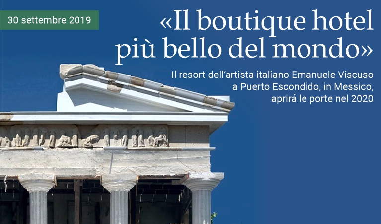 È così che l'artista siciliano descrive il progetto di Villa Viscuso nel centro di Puerto Escondido, sulla costa del Pacifico messicano, il primo hotel della catena Six Edens Resorts, da lui stesso fondata, che vedrà come secondo momento lo sviluppo di un grande complesso turistico appena fuori città su una proprietà di cinque ettari in riva al mare, con un fronte spiaggia di trecento metri. Villa Viscuso aprirà al pubblico non appena ultimata la piscina, la cui forma ricorda una piccola spiaggia, probabilmente nel secondo trimestre del 2020. Le suite saranno sette all'inizio —due con una piccola piscina privata e le altre con jacuzzi per 2-4 persone— e diverranno, a poco a poco, una dozzina al massimo. Ci sarà anche un hammam, ispirato ai bagni turchi d'oriente, di cui Emanuele Viscuso, architetto e autore di tutto, ha disegnato perfino le piastrelle in stile arabo. «Villa Viscuso sarà in stile neoclassico» —ha spiegato— «e i fregi saranno copie di originali greci e romani, realizzati da me su pannelli con la tecnica del trompe l'oeil come le carte da parati con le biblioteche antiche con cui ho rivestito chilometri quadrati di case, hotel, uffici e club in tutto il mondo». «Inoltre» —ha aggiunto l'artista— «l'hotel è situato in panoramica sulla spiaggia di Zicatela, paradiso mondiale dei surfisti. Ho già ricevuto prenotazioni a scatola chiusa da Franco Nero, Barbara Bouchet e Cristiana Versace». Prima di concludere, Viscuso ha voluto precisare anche un dettaglio non da poco, soprattutto per i viaggiatori europei: «in ogni bagno ci sarà il bidet».