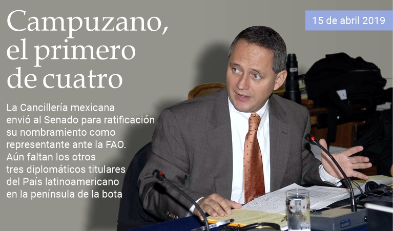 15 de abril de 2019 - La semana pasada, la Secretaría de Relaciones Exteriores de México remitió al Senado de la República para su ratificación los nombramientos de 16 miembros de su servicio exterior en Europa, Asia-Pacífico y Medio Oriente. Entre ellos, Luis Javier Campuzano Piña fue propuesto como representante permanente ante la Organización de las Naciones Unidas para la Alimentación y la Agricultura (FAO). Su cargo incluye también la representación ante las otras agencias de las Naciones Unidas con sede en Roma —el Fondo Internacional de Desarrollo Agrícola (FIDA) y el Programa Mundial de Alimentos (PMA)— así como ante el Instituto Internacional para la Unificación del Derecho Privado. Se trata del primer integrante del gobierno del presidente Andrés Manuel López Obrador perteneciente al cuerpo diplomático titular mexicano en la península de la bota, en espera de que sean dados a conocer los nombres de los embajadores en Roma y en el Vaticano, así como del Cónsul en Milán. Campuzano ingresó al Servicio Exterior mexicano en 1989 y tiene rango de embajador desde 2011. Fue embajador ante el Reino de Noruega y Kenia, país donde también fungió como representante permanente de México ante el Programa de Naciones Unidas para el Medio Ambiente y ONU-Hábitat. Asimismo, se desempeñó como representante alterno en las Misiones Permanentes ante la Organización de los Estados Americanos, la Organización de las Naciones Unidas y los organismos internacionales con sede en Ginebra y Viena. (massimo barzizza / puntodincontro.mx)