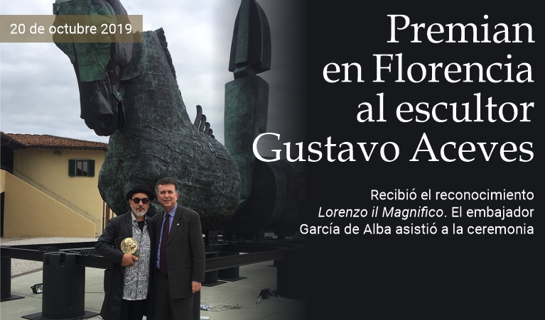 20 de octubre de 2019 - El escultor mexicano Gustavo Aceves, quien desde hace varios años vive y traba en Pietrasanta, Italia, recibió el premio internacional a la carrera “Lorenzo il Magnifico” durante la 12ª Bienal de Arte Contemporáneo de Florencia. El premio le fue otorgado «por haber representado magistralmente, a través de la escultura, fragmentos de la historia que evocan valores de la civilización y al mismo tiempo transmiten una advertencia para no repetir los horrores que ocurrieron en los eventos de la humanidad y de sus migraciones». «Es un premio no sólo a mi carrera» —comentó Aceves— «sino también al proyecto Lapidarium, que habla de paz y justicia y en el que participan muchos amigos, a quienes dedico este importante reconocimiento». A la ceremonia asistió también el nuevo embajador de México en Italia, Carlos García de Alba. (massimo barzizza / puntodincontro.mx)