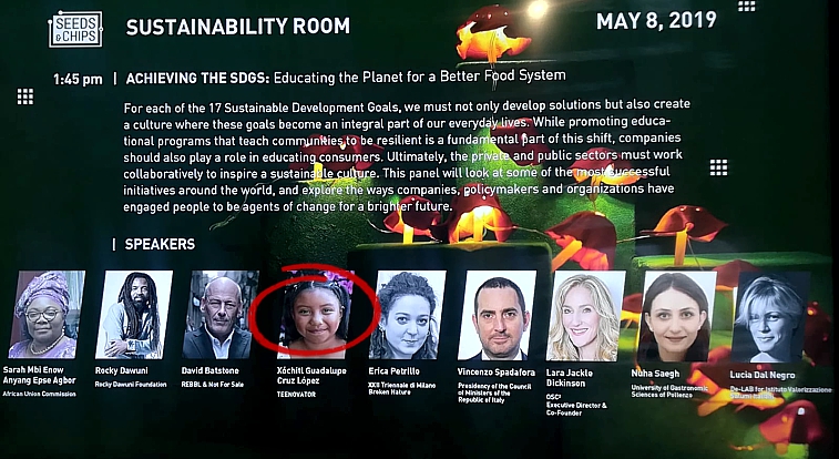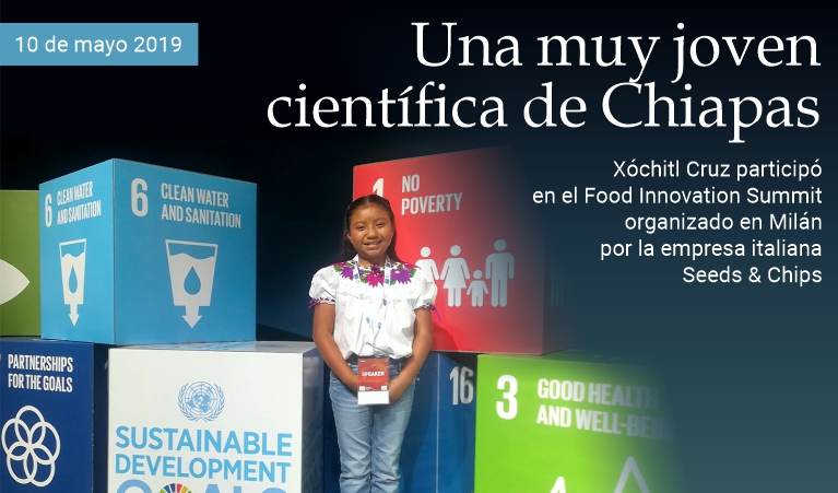 10 de mayo de 2019 - México participó en la Cumbre de Innovación Alimentaria Food Innovation Summit que organiza la empresa italiana Seeds & Chips. Del 6 al 9 de mayo de este año, se dieron cita en Milán líderes mundiales, grandes multinacionales, startups, líderes de opinión y talentos emergentes de todo el mundo a fin de compartir soluciones innovadoras para toda la cadena agroalimentaria que permitan construir un mejor sistema alimentario. México estuvo representado por la pequeña Xóchitl Guadalupe Cruz López, un prometedor talento de 10 años, originaria de Chiapas, México, quien inspiró a la audiencia al compartir su historia y sus proyectos. Xóchitl diseñó un laboratorio casero para extraer la esencia de las flores y creó un calentador de agua a partir de materiales reciclados para ayudar a las personas de bajos ingresos y al medio ambiente en su comunidad rural, obteniendo así el Reconocimiento ICN a la mujer que otorga el Instituto de Ciencia Nuclear (ICN) de la UNAM. Su próximo objetivo es colocar el prototipo en hogares de comunidades indígenas de Chiapas. Cruz López tuvo a su cargo la introducción de la ponencia Achieving the SDGs: Educating the Planet for a Better Food System, y su presentación tuvo el objetivo de compartir sus proyectos, las razones que la motivaron a crearlos y la importancia de colaborar para crear una sociedad más inclusiva y justa para todos. En México, Xóchitl Cruz es miembro de la asociación civil PAUTA (Programa Adopte un Talento) dependiente del Programa de Ciencias Nucleares de la UNAM, que se encarga de acercar a niños y jóvenes a la ciencia para favorecer el desarrollo de sus habilidades en este campo.