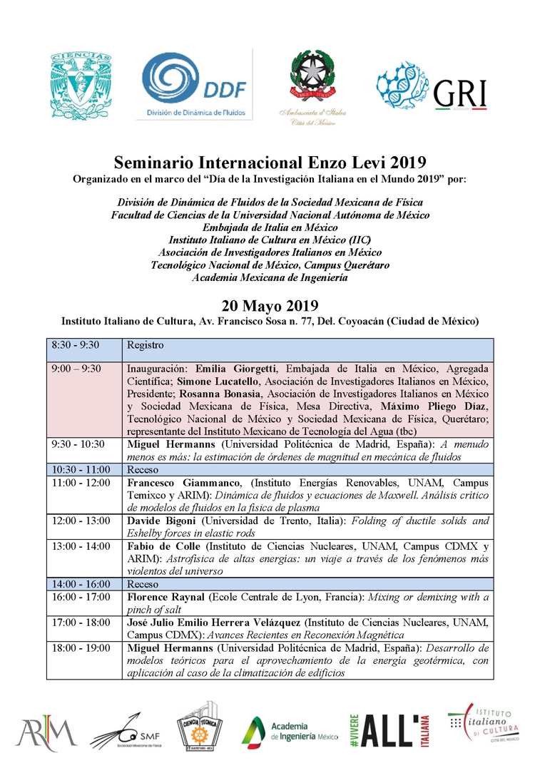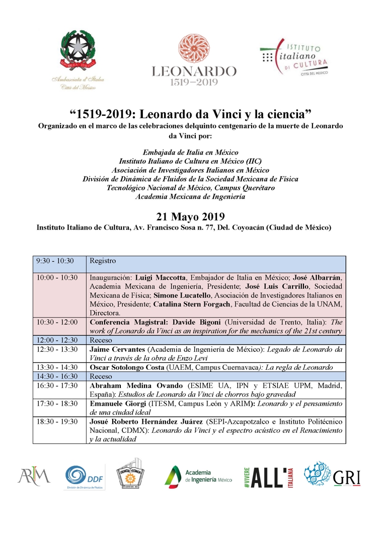 14 maggio 2019 - Nell'ambito delle celebrazioni della Giornata della ricerca italiana nel mondo e del 500° anniversario della morte di Leonardo da Vinci, l'Ambasciata d'Italia in Messico, la Divisione di fluidodinamica della Società messicana di fisica, la Scuola superiore di ingegneria meccanica ed elettrica dell'Istituto Politecnico Nazionale, l'Associazione dei ricercatori italiani in Messico e l'Accademia messicana di ingegneria organizzano due importanti eventi ad ingresso gratuito che si terranno il 20 e 21 maggio presso la sede dell'Istituto Italiano di Cultura di Città del Messico: il Seminario Enzo Levi 2019 e il Seminario bilaterale Italia-Messico 1519-2019: Leonardo da Vinci e la scienza. Enzo Levi, ricercatore di grande presenza internazionale nato a Torino e poi naturalizzato messicano, fondò l'Istituto di ingegneria dell'Università Nazionale Autonoma del Messico (UNAM). L'obiettivo del seminario che porta il suo nome è promuovere la ricerca nel campo della fluidodinamica e motivare gli studenti a seguire questa importante linea di ricerca. I relatori —studiosi provenienti da centri italiani, messicani, spagnoli e francesi— illustreranno applicazioni della fluidodinamica alla fisica del plasma, all'elasticità, all'astrofisica e ai sistemi di controllo climatico degli edifici. L'edizione 2019 del seminario dedicato allo scienziato torinese si terrà il 20 maggio dalle 9:00 alle 19:00 e sarà inaugurata da Emilia Giorgetti, addetta scientifica dell'Ambasciata d'Italia, accompagnata da Simone Lucatello e Rosanna Bonasia dell'ARIM. Per ulteriori informazioni e per la registrazione dei partecipanti, gli interessati possono scrivere all'indirizzo rosannabonasia017@gmail.com. Il giorno successivo, 21 maggio, dalle 9:00 alle 19:30 sarà la volta del simposio 1519-2019: Leonardo da Vinci e la scienza in cui, con un approccio multidisciplinare e divulgativo, verrà presentata parte dell'influenza che il pensiero e le attività del genio toscano hanno avuto nei secoli sullo sviluppo della scienza e della tecnologia. Dopo il saluto di benvenuto da parte dell'Ambasciatore d'Italia in Messico, Luigi Maccotta, del presidente dell'Accademia messicana di ingegneria, José Albarrán, del presidente dell'Associazione dei ricercatori italiani in Messico, Simone Lucatello, della direttrice della Facoltà di scienze dell'UNAM, Catalina Stern e di José Luis Carrillo, della Società messicana di fisica, ricercatori italiani e messicani affronteranno questioni relative alla meccanica, alla fluidodinamica, alla pianificazione urbana e all'acustica. Il relatore d'onore di questa seconda giornata di attività sarà il dott. Davide Bigoni, del Dipartimento di Ingegneria Civile, Meccanica e Ambientale dell'Università di Trento, illustre ricercatore di livello mondiale in questioni di meccanica strutturale. Il dott. Bigoni presenterà la laectio magistralis: The work of Leonardo da Vinci as an inspiration for the mechanics of the 21st century. Per maggiori informazioni e iscrizioni a questo secondo evento emiliagiorgetti59@gmail.com.