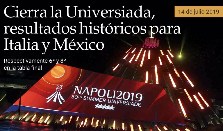14 de julio de 2019 - Más de 35 mil espectadores asistieron esta noche a la ceremonia de clausura de la 30ª Universiada de verano 2019 en Nápoles, en presencia del Primer Ministro de Italia, Giuseppe Conte, el presidente de la FISU, Oleg Matytsin, el presidente de la Región de Campania, Vincenzo De Luca y el alcalde de Nápoles, Luigi De Magistris. Durante el evento se celebró un homenaje a Pietro Mennea —fallecido en 2013 a la edad de 60 años— quien en 1979 en la Universiada de la Ciudad de México logró el récord mundial en los doscientos metros planos, con el ya famoso tiempo de 19.72 segundos, que sigue siendo el récord europeo. La tabla final ve a Japón en primer lugar, seguido por Rusia, China, Estados Unidos y Corea del Sur. Italia es sexta con 44 medallas (15 oros, 13 platas y 16 bronces), resultado que iguala al de Kazan 2013, aunque entonces los oros fueron sólo 6. También la delegación mexicana finalizó con la mejor actuación de su historia en estos certámenes, al mejorar el medallero de China Taipei 2017 y ubicándose en octavo lugar general en la cita italiana, que reunió a más de ocho mil estudiantes deportistas de 127 países participantes. (massimo barzizza / puntodincontro.mx)