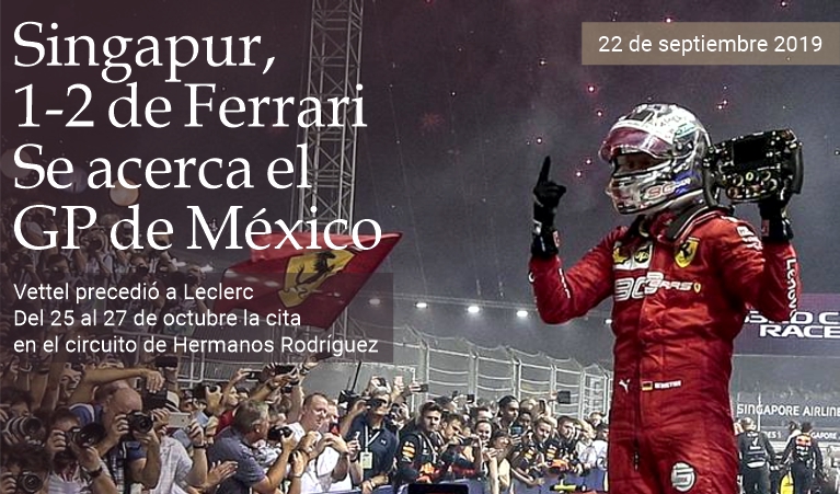 22 de septiembre de 2019 - Uno-dos de Ferrari en el Gran Premio de Singapur, válido para el Campeonato del Mundo de Fórmula 1. El alemán Sebastian Vettel volvió a la victoria, precediendo en la línea de meta a su compañero de equipo, el monegasco Charles Leclerc, que obtuvo dos trinufos en Bélgica y Monza. Para el equipo de Maranello es el tercer primer lugar consecutivo en el campeonato mundial de pilotos. En el escalón más bajo del podio estuvo el holandés Max Verstappen, cuarto el británico Lewis Hamilton. Se acerca así —con la escudería del Cavallino Rampante en buenas condiciones de competitividad— la fecha del Gran Premio de México, 18ª cita de esta temporada y quinta año consecutivo para la que ha sido considerada en más de una ocasión la mejor competencia del calendario, por su organización y afluencia de público. La edición 2019 se llevará a cabo del 25 al 27 de octubre en el circuito Hermanos Rodríguez de la capital mexicana. (massimo barzizza / puntodincontro.mx)