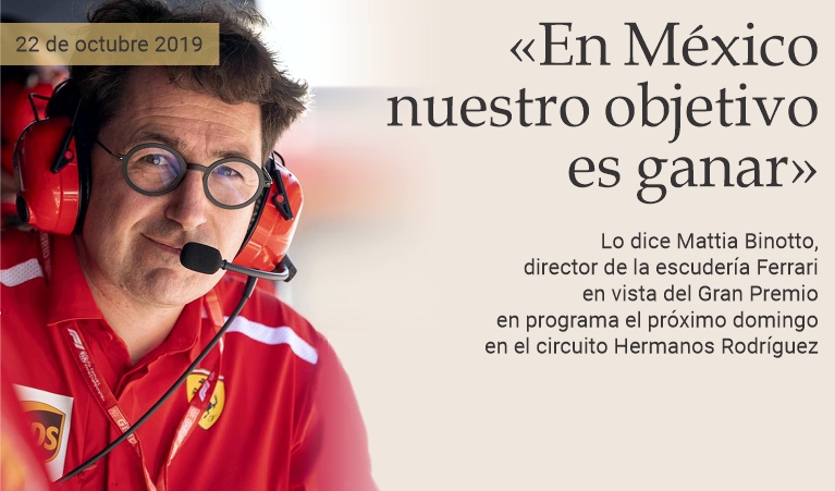 22 de octubre de 2019 - «Después de dos carreras en las que pudimos haberlo hecho mejor, nos presentamos en México con el deseo de llevar a casa el máximo resultado. Intentaremos ganar la sexta pole position consecutiva y luego ir por la victoria». Así lo afirmó el director del equipo de Ferrari, Mattia Binotto, en declaraciones publicadas en el sitio web del equipo en vista del Gran Premio programado para el domingo en el circuito Hermanos Rodríguez de la Ciudad de México. «La pista está llena de dificultades, algunas de las cuales están relacionadas con el hecho de que se corre a más de dos mil metros de altura, lo cual complica muchísimo el balance y la configuración de la unidad de potencia, que requieren ajustes específicos. El circuito tiene curvas de diferentes tipos, pero también rectas largas en las que siempre se superan los récords de velocidad máxima. El compromiso entre la velocidad máxima y la velocidad en las curvas dictará las opciones de carga aerodinámica con las que saldremos a la pista», concluyó Binotto. (massimo barzizza / puntodincontro.mx)