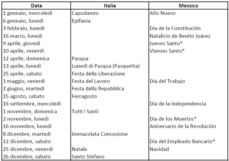 1 gennaio 2020 - Ecco l'elenco dei giorni festivi del 2020 in Italia e in Messico. Per l'Italia sono state considerate esclusivamente le festività legalmente riconsciute a livello nazionale, mentre per il Messico la tabella comprende sia le date ufficiali, sia quelle in cui le istituzioni finanziarie rimarranno chiuse, queste ultime segnalate da un asterisco.