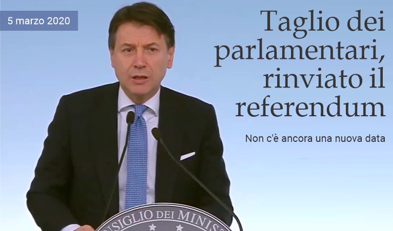 5 marzo 2020 (ore 17:25) - Via libera del Consiglio dei ministri al rinvio del referendum sul taglio dei parlamentari, previsto il 29 marzo. Il premier Giuseppe Conte ha detto: «Abbiamo anche deliberato di rinviare il referendum costituzionale [... che era] avvistato a fine mese. Siamo ormai in prossimità e bisognava fare chiarezza sul punto. Abbiamo valutato l'opportunità di rinviarlo, non c'è ancora una nuova data quindi al momento si tratta di un rinvio senza data, sine die, come si dice tecnicamente».