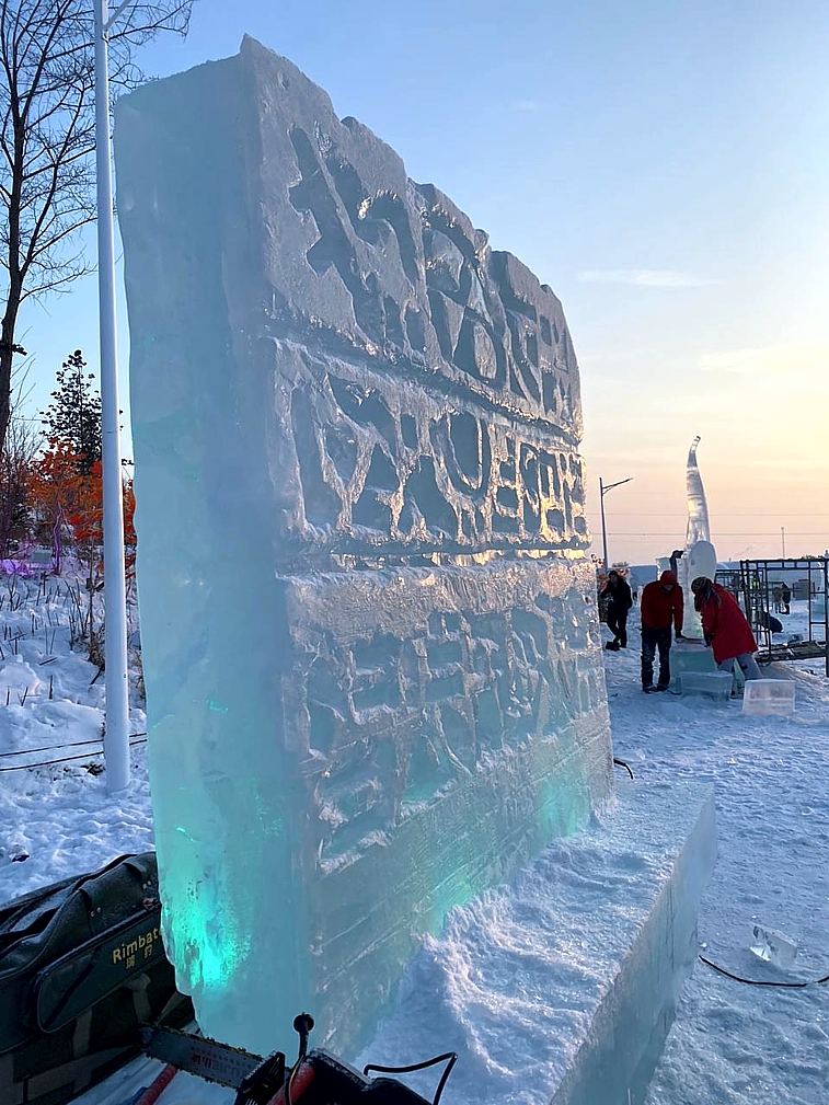 2 febbraio 2020 (ore 18,15) - Emanuele Viscuso è rientrato in Messico, dove vive, dopo un lungo periodo passato in Cina, invitato dal Comitato organizzatore dello Snow & Ice Park di Changchun. In questo specialissimo contesto, lavorando a una temperatura media di venti gradi sotto zero, ha realizzato un’opera cesellata nel ghiaccio e intitolata Messaggio Cosmico di Pace. Ispirato da vecchie pietre con iscrizioni in lingue antiche ed evocando grandi ritrovamenti archeologici del passato, come la Pietra di Rosetta, Emanuele Viscuso alcuni anni fa aveva creato nel suo storico studio di Miami una serie di opere mai mostrate prima, da lui stesso battezzate Archeologia Spaziale, con iscrizioni in lingue e caratteri immaginari. Secondo l’autore, i pezzi di Archeologia Spaziale potrebbero «provenire dal passato, ma anche dal futuro, così come da altri mondi e altri universi paralleli». Nessuno ne conosce il significato, ma l'artista ne rivela la natura di messaggi cosmici di pace. Viscuso ha realizzato le opere precedenti della serie in PVC, ma in quest’occasione ha trovato molto stimolante usare per la prima volta il ghiaccio, «un materiale naturale, assolutamente cosmico, che potrebbe essere terrestre ma anche extraterrestre». La Cina, un Paese con una storia incredibile e una cultura antica, è apparsa come il luogo perfetto per presentare al pubblico la sua Archeologia Spaziale e lanciare questo messaggio universale di pace.