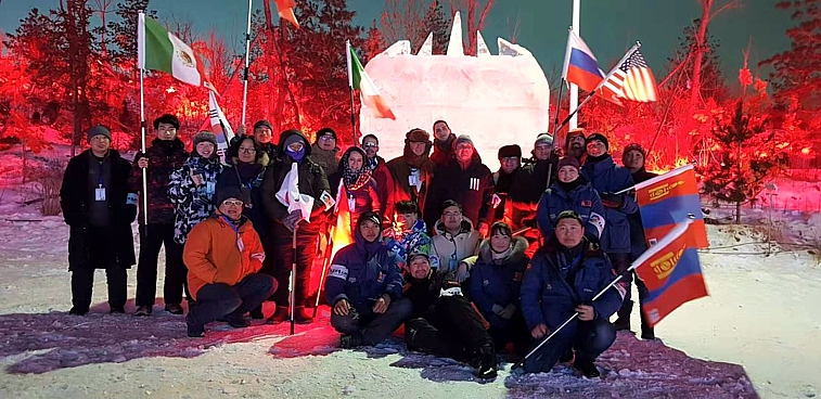 Il gruppo di lavoro davanti alla scultura Messaggio Cosmico di Pace Viscuso è stato quindi invitato a far parte della giuria per aggiudicare i premi per il concorso indetto da Changchun Lianhua Mountain Ecological Tourism Resort per opere d’arte create in neve compatta da artisti di tutto il mondo. Della giuria hanno fatto parte anche il professor Zhang Xin, della Normal University di Harbin, Shao Daming, assessore alla Cultura e al Turismo di Changchun, Jiang Licheng, presidente della Jilin Construction Group e Chen Yan, suo vicedirettore generale. Nel corso della cerimonia di premiazione è intervenuto con un discorso Salvo Bitonti, già direttore dell’Accademia Albertina di Torino e membro della giuria delle opere in ghiaccio, che, a nome della presidente dell’Accademia, Paola Gribaudo, ha insignito della medaglia dell’Amicizia il presidente del comitato organizzatore del grande parco tematico, Jiang Licheng. Lasciata Changchun, Viscuso ha passato qualche giorno ad Harbin per numerosi incontri con esponenti del mondo artistico e accademico. Il viaggio è proseguito per Pechino, dove l’artista ha realizzato un’altra scultura di ghiaccio nel parco Long Qing Xia, un luogo di grande bellezza naturale, nel quale scenografie di ghiaccio e neve, create da una serie di artisti internazionali, sono inserite nelle profondissime gole scavate dal fiume. Anche in questo caso si è trattato di un “Messaggio Cosmico di pace”, un’altra delle sue Archeologie Spaziali. A Pechino l’artista italiano è stato proclamato “Eccellenza Culturale”.