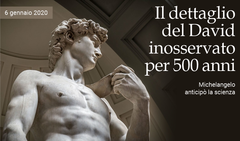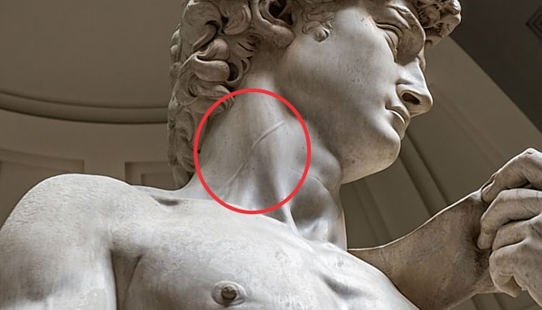 6 gennaio 2020 - C'è un dettaglio nel David di Michelangelo sfuggito a 500 anni di osservazioni e che conferma il genio del grande scultore, pittore, architetto e poeta italiano, in grado col suo “occhio clinico” di anticipare la scienza. Se in molte sculture, e nella fisiologia quotidiana delle persone, la vena giugulare dalla parte superiore del busto attraverso il collo non è visibile, infatti, nel capolavoro del Rinascimento esposto a Firenze è chiaramente “distesa” e in rilievo sopra la clavicola di David. Come accadrebbe in ogni giovane in salute che si trova ad un livello di eccitazione perché deve affrontare un avversario potenzialmente letale. In questo caso, Golia.