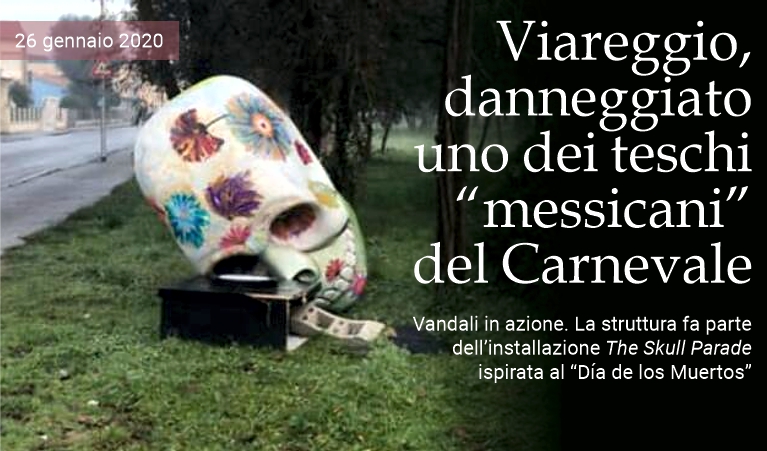 26 gennaio 2020 - Vandali in azione a Viareggio contro una delle installazioni del Carnevale dedicata al gemellaggio con Città del Messico e ispirate al Día de los muertos. Uno dei teschi che sono stati sistemati in città è stato divelto dal suo basamento e danneggiato. Immediato il commento del sindaco, Giorgio Del Ghingaro: «Dobbiamo ribellarci alla gente cattiva, a quelli che sparlano, a quelli che raccontano bugie e seminano livore sul loro triste cammino. Chi distrugge fa male a tutti. Dobbiamo ribellarci regalando bellezza, serenità, speranza». L'installazione The Skull Parade è nata da una collaborazione tra la Fondazione Carnevale di Viareggio, il Comune di Viareggio e il Lu.C.C.A. —Lucca Center of Contemporary Art— e sono state proprio le celebrazioni del Día de los muertos ad accendere la fantasia degli ideatori del progetto che, a modo loro, hanno voluto utilizzare il simbolo del teschio come palinsesto narrativo, come elemento sul quale manifestare pensieri, stati d'animo o semplici racconti decorativi in grado di trasformarlo in uno strumento evocativo e comunicativo. In questo contesto, dieci artigiani-artisti e dieci artisti internazionali si sono confrontati con l'archetipo del cranio: un volume a tuttotondo di 165x120x180 cm, assolutamente bianco, pronto ad accogliere le sollecitazioni di ciascun creativo. Il curatore, Maurizio Vanni, ha voluto inoltre suggerire una possibile interpretazione-sollecitazione evidenziando le simbologie e i riferimenti esoterici più utilizzati nel corso della storia dell'arte occidentale: la vanità e lo scorrere del tempo. I “teschi d'autore” rimarranno disseminati in diversi spazi della città di Viareggio durante l’edizione 2020 del Carnevale e fino all'8 marzo. (massimo barzizza / puntodincontro.mx)