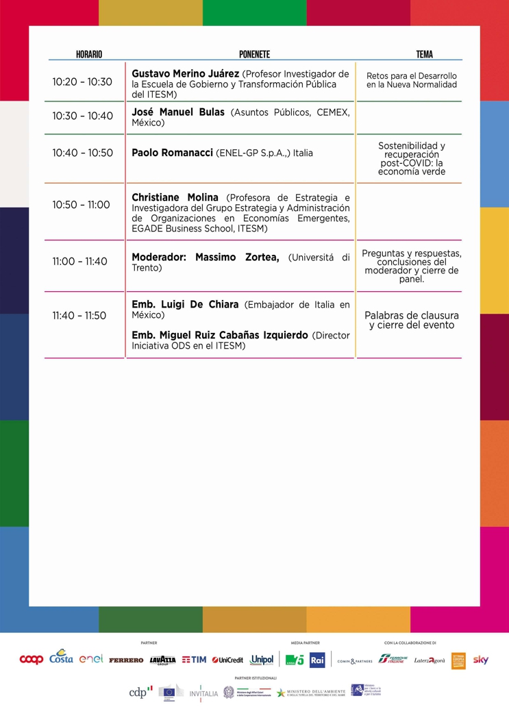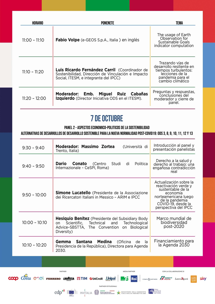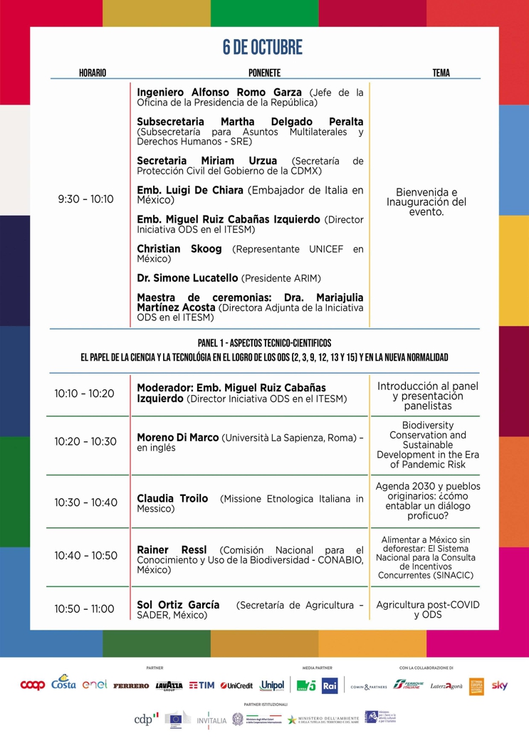 2 de octubre de 2020 (3:01 hrs.) - El Festival de Desarrollo Sostenible (del 22 de septiembre al 8 de octubre) es la mayor iniciativa italiana para concientizar y movilizar a ciudadanos, empresas, asociaciones e instituciones sobre temas de sostenibilidad económica, social y medioambiental. En este contexto, los días 6 y 7 de octubre, a través de la plataforma Zoom del Instituto Tecnológico y de Estudios Superiores de Monterrey (ITESM), se llevará a cabo un panel de expertos italianos y mexicanos —biólogos, agrónomos, antropólogos, economistas y representantes de empresas— que dialogarán sobre la emergencia mundial causada por el virus SARS-CoV-2 y los retos ligados a la reactivación de las interacciones sociales y económicas en nuestro planeta. Las intervenciones estarán enfocadas al análisis de la situación actual y de las perspectivas futuras bajo el punto de vista de la resiliencia, la sostenibilidad y el cumplimiento de los objetivos y metas de la agenda 2030 aprobada por la ONU. La iniciativa, organizada por la Embajada de Italia en México, el ITESM y la Asociación de Investigadores Italianos (ARIM), contará con la participación, entre otras personalidades, de Alfonso Romo, Jefe de la Oficina de la Presidencia de la República, Martha Delgado, Subsecretaria para Asuntos Multilaterales y Derechos Humanos de la Secretaría de Relaciones Exteriores, Myriam Urzúa, Secretaria de Gestión Integral de Riesgos y Protección Civil del Gobierno de la Ciudad de México, Luigi De Chiara, Embajador de Italia en México, Miguel Ruiz Cabañas, director de la Iniciativa de ODS en el ITESM y ex-embajador de México en Italia, Christian Skoog, representante de UNICEF en México y Simone Lucatello, presidente de la ARIM. Las intervenciones de los participantes están programadas entre las 9:30am y las 12:00pm (hora del centro de México) para ambos días del foro. Los interesados pueden conectarse a través del siguiente enlace: https://t.co/LmzTPjkTPc?amp=1 con el código de acceso 684281.