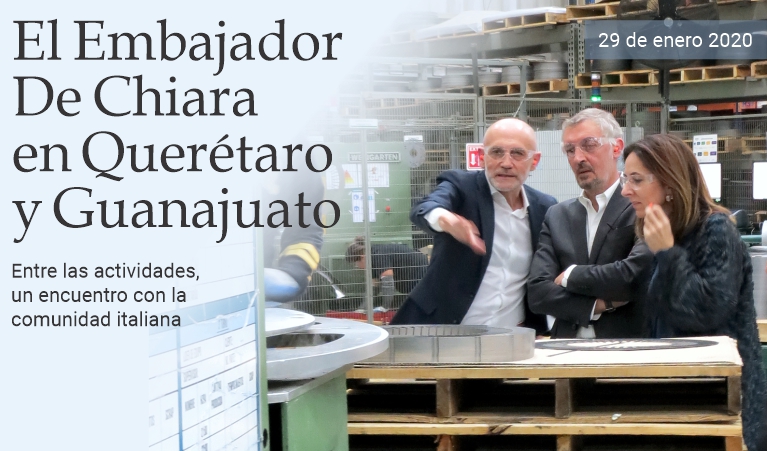 29 de enero de 2019 - El sábado 25 de enero el Embajador de Italia en México, Luigi De Chiara, viajó a la ciudad de Querétaro, donde visitó las instalaciones de la planta de Eurotranciatura —empresa líder en laminaciones para máquinas de rotación eléctrica— y se reunió con la comunidad italiana del Bajío, región geográfica, histórica, económica y cultural del Centronorte-Occidente de México, sede de los establecimientos productivos de varias empresas del Bel Paese. Leonardo Franchini, titular de la Agencia Consular Honoraria de Italia en Querétaro y Director General de Eurotranciatura, y Eduardo Arana, Director General Adjunto de la empresa, acompañaron al Embajador De Chiara, a su esposa Idoia Uribarri y a Flavio Sereni, responsable de la oficina económico-comercial de la Embajada, a recorrer la planta antes de reunirse con aproximadamente 70 miembros de la comunidad italiana para un brindis. La ciudad de Querétaro también es sede, desde el año pasado, del Capítulo Bajío de la Cámara de Comercio Italiana en México, copatrocinador de este encuentro. El jefe de la diplomacia italiana en México continuó su gira a principios de esta semana y se reunió con el Gobernador del Estado de Querétaro, Francisco Domínguez Servién, y el Presidente Municipal de Colón, Alejandro Ochoa Valencia, con quien refrendó el pacto de amistad signado en 1994 entre este municipio y la ciudad de Génova. En el Estado de Guanajuato visitó la planta de Pirelli en Silao —que, utilizando tecnología de vanguardia, emplea a aproximadamente 3,000 trabajadores— y fue recibido por el Gobernador Diego Sinhue Rodríguez Vallejo. (massimo barzizza / puntodincontro.mx)
