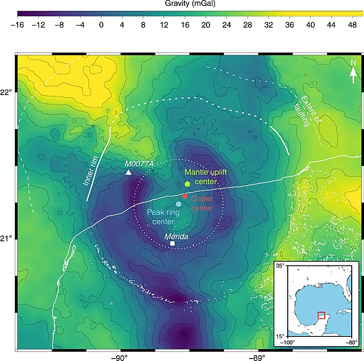 El mapa muestra las anomalías de gravedad de Bouguer cerca del sitio del impacto. El punto rojo marca la posición del centro del cráter, el verde indica la elevación máxima del manto y el azul resalta el núcleo del anillo del pico, una característica de los abismos formados por grandes colisiones. Una delgada línea blanca sigue el perfil de la costa, mientras que los puntos corresponden a los cenotes. El cuadro marca la ubicación de la ciudad de Mérida, actual capital del Estado mexicano de Yucatán. Según la datación más precisa —difundida por la revista científica estadounidense Science el 21 de febrero de 2019— el impacto ocurrió hace 66,052,000 años, con un margen de error de 8 mil años más o menos. El segundo episodio que provoca que todas las coincidencias sean perfectamente compatibles con la teoría de la Ley de Murphy se refiere al tipo de rocas embestidas por el asteroide. El enorme meteorito de 17 kilómetros de diámetro y una densidad de 2,630 kilogramos por metro cúbico, cayó a una velocidad de 12 kilómetros por segundo en un mar cuyo fondo estaba compuesto de sedimentos ricos en tiza, la peor variante posible entre todas las rocas que podrían haber sido alcanzadas. En el momento del impacto, estas rocas cubrían solo el 13% de la superficie del planeta. Se liberaron 325 mil millones de toneladas de sulfatos y 425 mil millones de toneladas de dióxido de carbono que causaron lluvia ácida. El resultado fue que la temperatura cayó 26 grados en las tierras emergidas y 11 grados en los mares a 50 metros de profundidad. En los trópicos, los promedios cayeron de 27 a 5 grados durante tres años. El clima tardó 30 años en recuperarse. El polvo levantado por el impacto (15 mil millones de toneladas) y las cenizas causadas por los incendios (que destruyeron la capa de ozono) es posible que hayan causado dos años de oscuridad. (massimo barzizza / puntodincontro.mx)