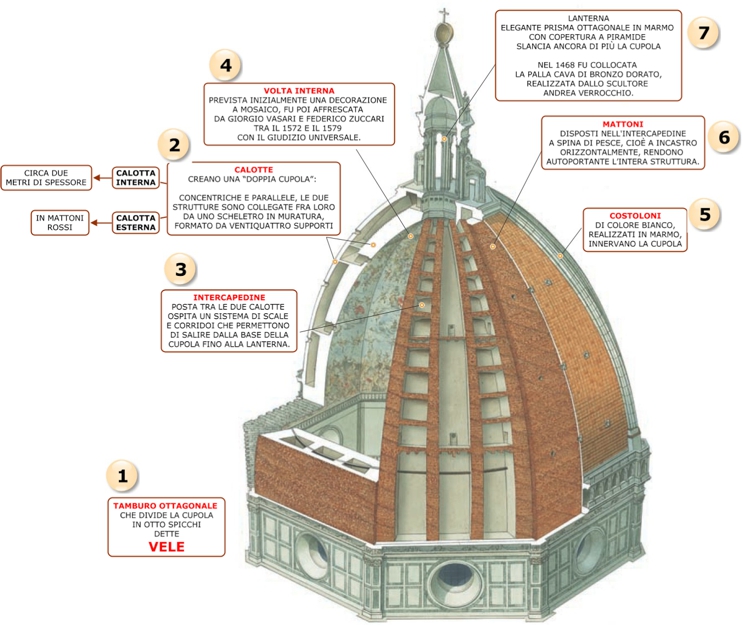Sarà il modello per altre cupole nel mondo, prima fra tutte quella di San Pietro in Vaticano su progetto di Michelangelo. Nel 2020, l'Opera di Santa Maria del Fiore aveva previsto un ampio programma d’iniziative per celebrare questa importante ricorrenza, che a causa della pandemia da Covid-19 sono state tutte rimandate. L’edificazione della Cattedrale di Firenze, iniziata nel 1296, era giunta all’alba del Quattrocento al livello del tamburo ottagonale, ma si era fermata da più di 120 anni di fronte alla sfida ingegneristica di “voltar la cupola”, uno spazio di ciclopiche dimensioni che si apriva sul cielo e faceva paura solo a guardarlo. Nessuno fino a quel momento aveva avanzato un progetto credibile. Le tecniche del tempo, che prevedevano impalcature da terra e centine di supporto, sembravano inadeguate. Troppo alta la cupola e troppo vasta. Per questo, l'Opera di Santa Maria del Fiore, patrocinata dall’Arte della Lana, aveva bandito due anni prima, il 20 agosto del 1418, un concorso che alla fine vedrà vincitore tra i molti Filippo Brunelleschi. L'incarico fu affidato sulla fiducia. Brunelleschi, infatti, non volle rivelare i suoi piani. Dettò però una “regola costruttiva”, in base alla quale la cupola, formata da due calotte separate ma interconnesse, avrebbe dovuto essere costruita senza armatura, o meglio con armatura autoportante e cioè fissata ai cerchi di mattoni che andavano via via ergendosi. Di fronte agli “operai” che ancora esitavano riguardo alla tenuta delle strutture da lui concepite, Filippo, disse: «Ma ricordandomi che questo è tempio sacrato a Dio et alla Vergine, mi confido che, facendosi in memoria sua, non mancherà di infondere il sapere dov’è non sia, et aggiungere le forze e la sapienza e l’ingegno a chi sarà autore di tal cosa». I lavori di costruzione della cupola avranno fine il primo agosto del 1436. La lanterna con copertura a cono, su disegno di Brunelleschi, sarà realizzata solo dopo la sua morte, avvenuta nel 1446, così come la palla di rame dorato con la croce, opera di Andrea del Verrocchio, terminata venti anni dopo. La Cupola non sarà un'impresa senza precedenti solo dal punto di vista architettonico e ingegneristico, ma anche per l'organizzazione del cantiere di cui Filippo Brunelleschi progetta ogni dettaglio: dalle macchine per costruire, ai ponteggi e fino agli attrezzi. In anticipo di secoli, saranno i progetti dei ponteggi “aerei” con parapetti di protezione per le cadute e vista sul vuoto per le vertigini, così come gli spazi “in quota”, dove gli operai consumavano il cibo e le bevande, evitando così di esporsi al pericolo delle salite e delle discese. Nei sedici anni della durata del cantiere, si ha notizia di una sola “morte bianca”, benché vi lavorassero circa sessanta persone. A Brunelleschi si devono, inoltre, gli attrezzi di cantiere —oggi visibili al Museo dell'Opera del Duomo— e le straordinarie macchine per il trasporto e la messa in opera dei materiali, che saranno studiate dai suoi successori, prima fra tutti Leonardo da Vinci. Enormi gru in grado di ruotare, carrelli orizzontali e verticali, leve e argani a più velocità, mossi dalla semplice forza animale e dal sapiente uso d’ingranaggi, pesi e contrappesi. (aise.it / puntodincontro.mx / adattamento di massimo barzizza)
