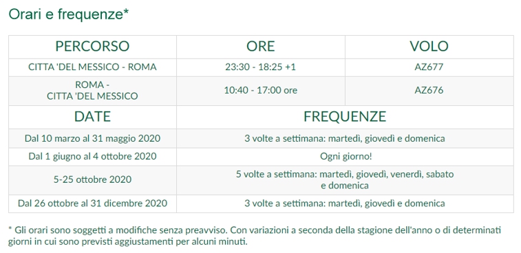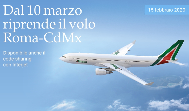 15 febbraio 2020 (ore 20:22) - Dopo la sospensione del servizio iniziata —come ogni anno— il 13 gennaio, da martedì 10 marzo Alitalia riprenderà il volo diretto tra Roma e Città del Messico, che viene effettuato con un Boeing 777-200ER di 293 posti configurati con tre classi di servizio: Business Class, Premium Economy Class ed Economy Class. I viaggiatori possono scegliere Roma come destinazione finale, collegarsi ad altre destinazioni in Italia o approfittare della rete di voli Alitalia verso il resto dell'Europa, il Medio Oriente, il Nord Africa e l'Asia. Tramite l'opzione di code sharing con Interjet, inoltre, i passeggeri provenienti dall'Italia possono raggiungere le destinazioni di questa compagnia messicana dall'aeroporto internazionale di Città del Messico (AICM), mentre gli utenti Interjet hanno l'opportunità di fare uso delle rotte Alitalia, che da Roma si collegano, tra le altre, a destinazioni come Venezia, Torino e Napoli. Di seguito presentiamo le informazioni sugli orari e le frequenze del volo diretto Alitalia Roma-Città del Messico dal 10 marzo al 31 dicembre 2020.